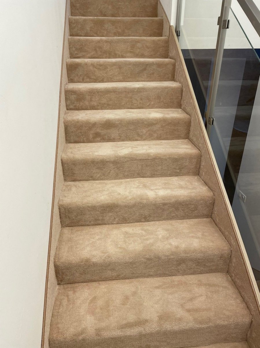 Realizácia drevených dubových parkiet v dizajne Herringbone s povrchovou úpravou olej. U nás nazývaný aj ako stromček. Jedna lamielka má rozmer 70x470 mm. Nášľapná vrstva z čistého dreva má 3 mm. Montáž prebieha celoplošným lepením k podkladu a spája sa na pero-drážku. Kúsok po kúsku ukladaním týchto malých lamielok sa vytvára nádherný, nadčasový dizajn, ktorý poznáme zo starších bytov. Na schody sme inštalovali metrážny koberec na podložke, ktorá zvýšila komfort a mäkkosť.
